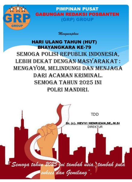 Pimpinan Pusat Gabungan Redaksi Posbanten (Grp) Group Mengucapkan hari ulang Tahun (hut) bhayangkara ke-79.