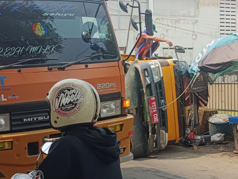 Truk sampah penuh muatan terguling di jalan Iskandar muda Neglasari Kota Tangerang Banten Rabu 7 Agustus 2024.