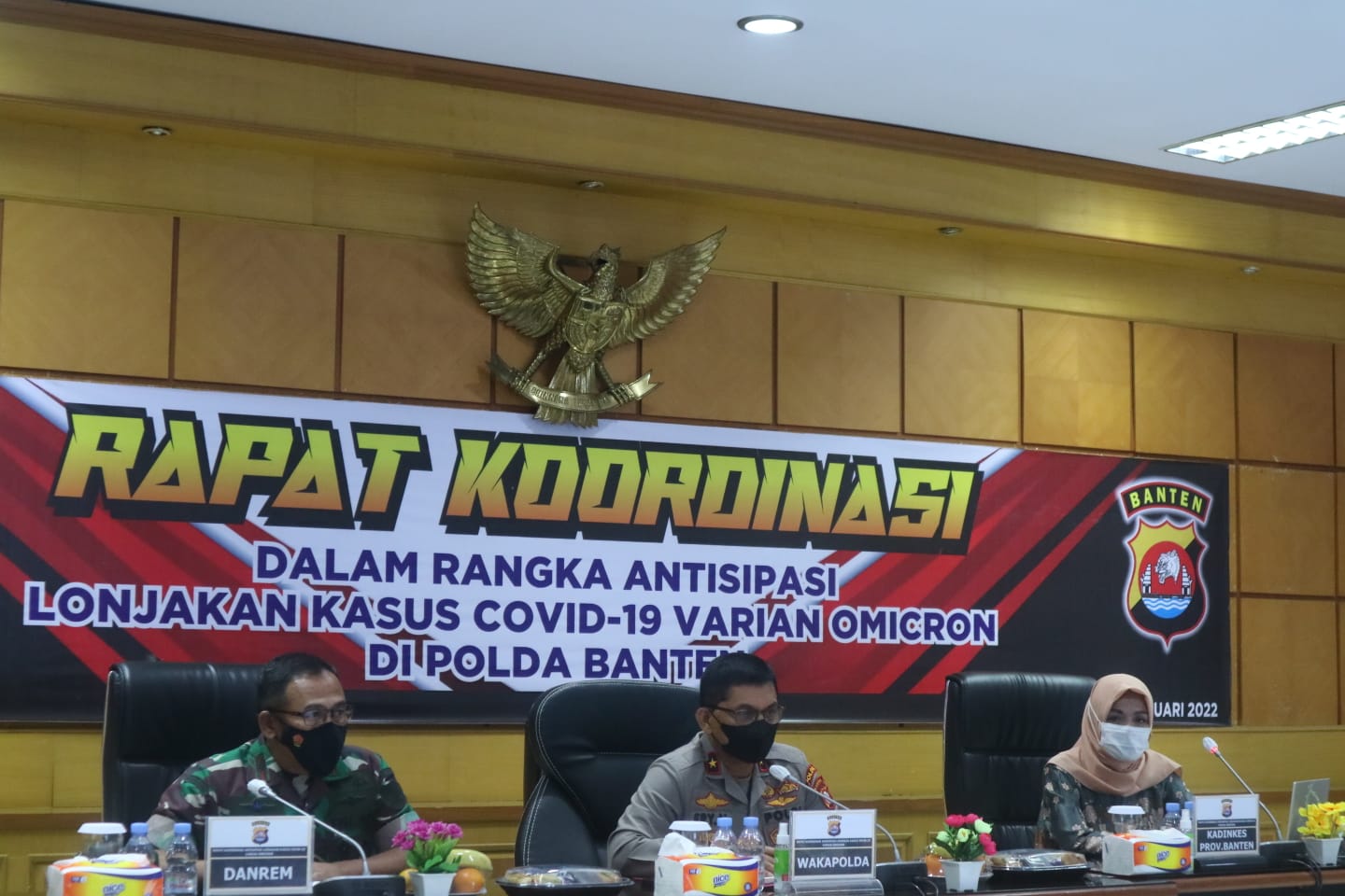 Dalam rangka mengantisipasi lonjakan kasus Covid-19 varian Omicron, Polda Banten mangadakan rapat koordinasi bersama Danrem 064/MY dan para Dandim, Kepala Dinas Kesehatan Propinsi dan Kabupaten/Kota Kepala BPBD Propinsi Banten serta para Kapolres dan PJU Polda Banten di Rupatama pada Selasa (25/01).