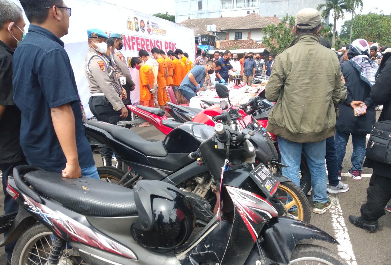 Kemudian Barang bukti yang berhasil kita amankan sebagaimana kami sampaikan tadi di samping sepeda motor sebanyak 8 unit ya Dari ujung sebelah sana ada CBR ada Honda Mio Beat kemudian ada juga kendaraan yang lain kita juga menemukan menyita kunci T