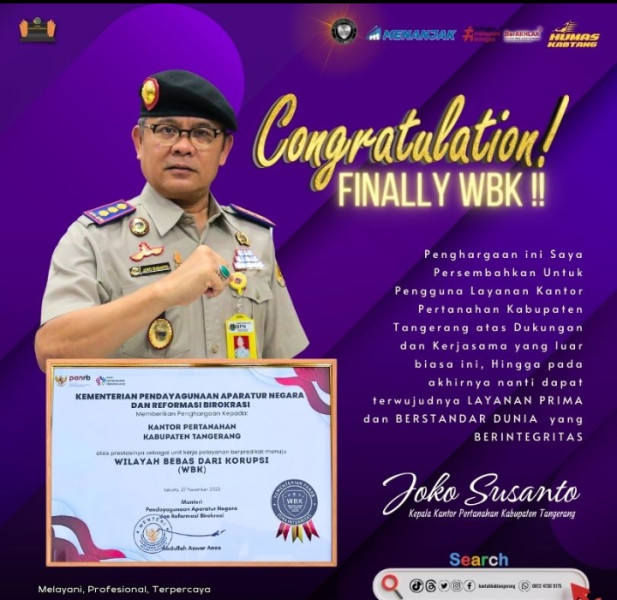 Diketahui, predikat Menuju Wilayah Bebas dari Korupsi (WBK), kini disandang oleh Joko Susanto,A.Ptnh.M.Si Kepala ATR/BPN Kabupaten Tangerang bersama jajaran Kub.TU.