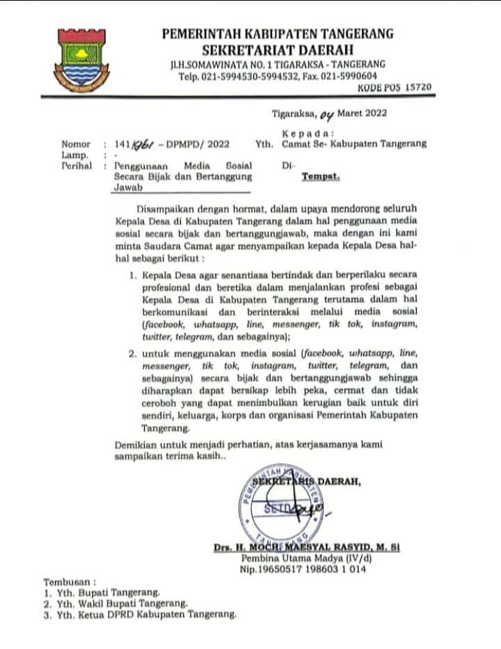 Sekda mengeluarkan intruksi pada ASN-PNS Tingkat Pemkab Tangerang, hati-hati mengunakan Medsos