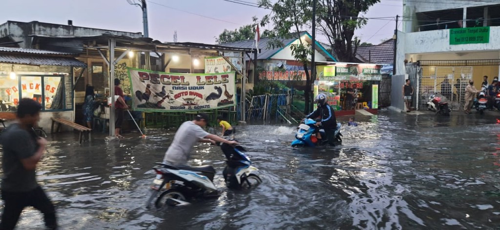 “Ya mas ini motor saya mogok, karena genangan air di jalan raya Kotabumi, ini sedengkul kaki saya dalamnya,” ujarnya.